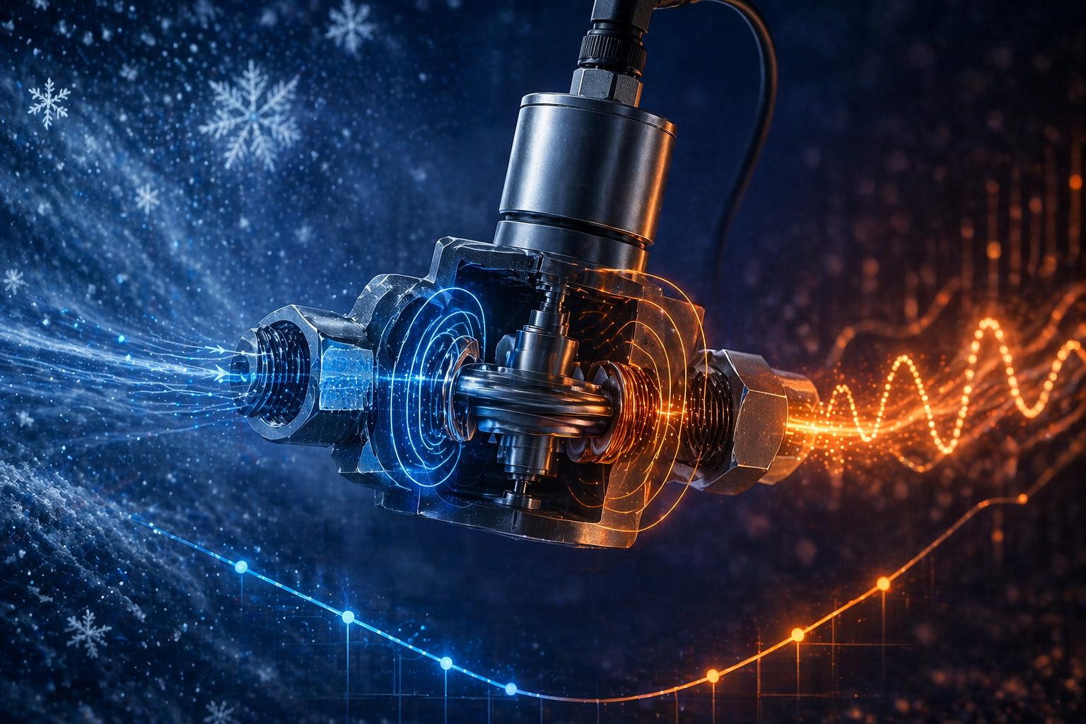 A typical orifice plate configuration is shown in the figure. The upstream side of the orifice will have the higher pressure and is connected through a three-valve manifold to the + port of the pressure transducer. The downstream side of the orifice is similarly connected to the – port of the pressure transducer. The three valve manifold is used to protect the pressure sensor from over-pressure when installing the pressure sensor into a working pipe.